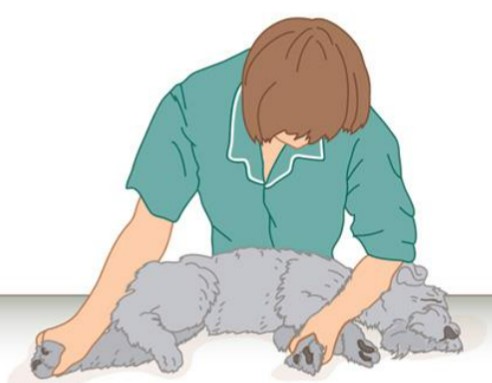 Wanneer je hond maar blijft spartelen of niet stil wil blijven liggen, is het nodig om je hond te fixeren. Leg de hond op zijn goede zijde, dit is de kant waar geen breuken, wonden of bloedingen zitten. Neem vervolgens de poten vast die op de grond of tafel liggen en hef deze licht op. Op deze manier kan de hond niet meer rechtstaan. Ondertussen houdt iemand anders de hond tegen de grond gedrukt door ter hoogte van de rug van de hond te staan en zijn onderarmen in de hals en de lies van het dier te leggen. Afhankelijk van de weerstand die de hond biedt zal deze persoon meer of minder weerstand moeten zetten. Vanaf dat de hond doorheeft dat hij zich beter niet kan verzetten zal hij zich overgeven.